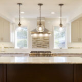 In the kitchen, beautiful quartzite counter tops play off of the warm, tan walls and wood floors. Center, is a large 5 stool island, with a dark wooden base, perfect for seating guests and loved ones. Windows bring in natural light that brighten up the stove area, along with a hanging 3 bulb chandelier above the island.