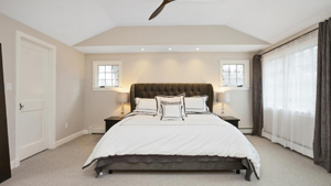 The master suite is spacious, with angled walls and arched ceilings. The space has light walls, and a tan carpet. A wooden fan is centered in the room, along with recessed lighting. Large windows let in natural light on the right side of the bedroom. A queen-sized bed sits in the middle of two rectangular windows on the back wall. Two dark wood night tables and decorative lamps sit on either side of the bed.