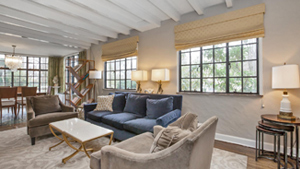 The living area has hardwood flooring and a wood beamed ceiling. The open floor plan of the space leads into the dining area, where a chandelier lights the space up. There are large framed windows behind three couches. End tables with lamps line the back wall. A stone hearth with a wood burning fireplace, and white wood mantel sits in front of the seating area.