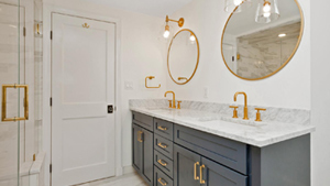 The master bathroom features marble countertops, navy cabinetry with brass accents, and a glass shower with a brass handle. Circular mirrors with brass frames decorate the white walls of the bathroom. Brass lights with glass illuminate the bathroom, along with recessed ceiling lights. The floor is a mix of white and grey marble.