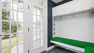 The mudroom features two extra large doors and porcelain tile flooring. A green bench with white cabinetry lines the walls and provides storage opportunities. There are multiple coat cooks for under the cabinets.