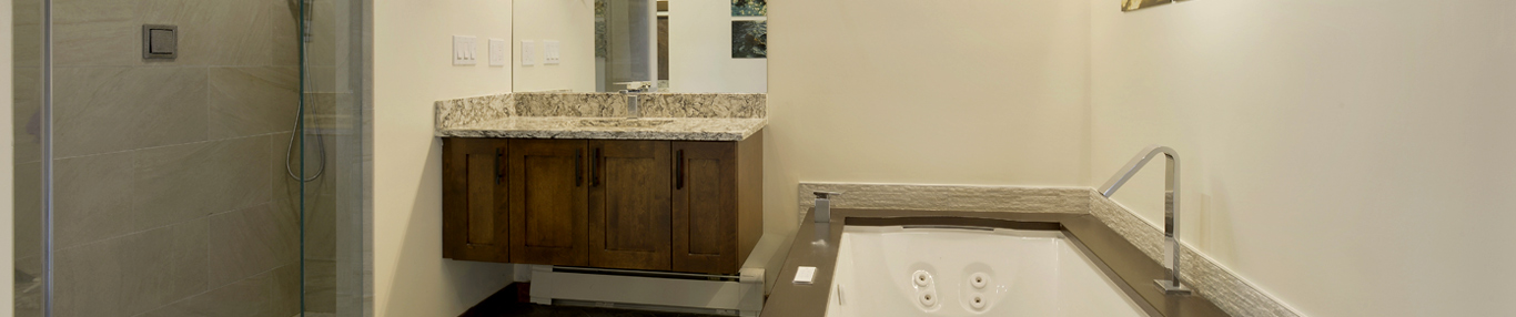 Remodeling Consultants | Pound Ridge Master Bathroom RenovationGZMV Mud was used as material for the water closet floor. The tub is a Jacuzzi fusion jetted spa tub with a Wenge wood platform top. Solid wood cabinetry with marble countertops line the far wall, and underneath a large mirror. Strip lighting is found underneath the wood paneling that frames the bathroom, along with a copious amount of natural light from the skylight in between the rafters.