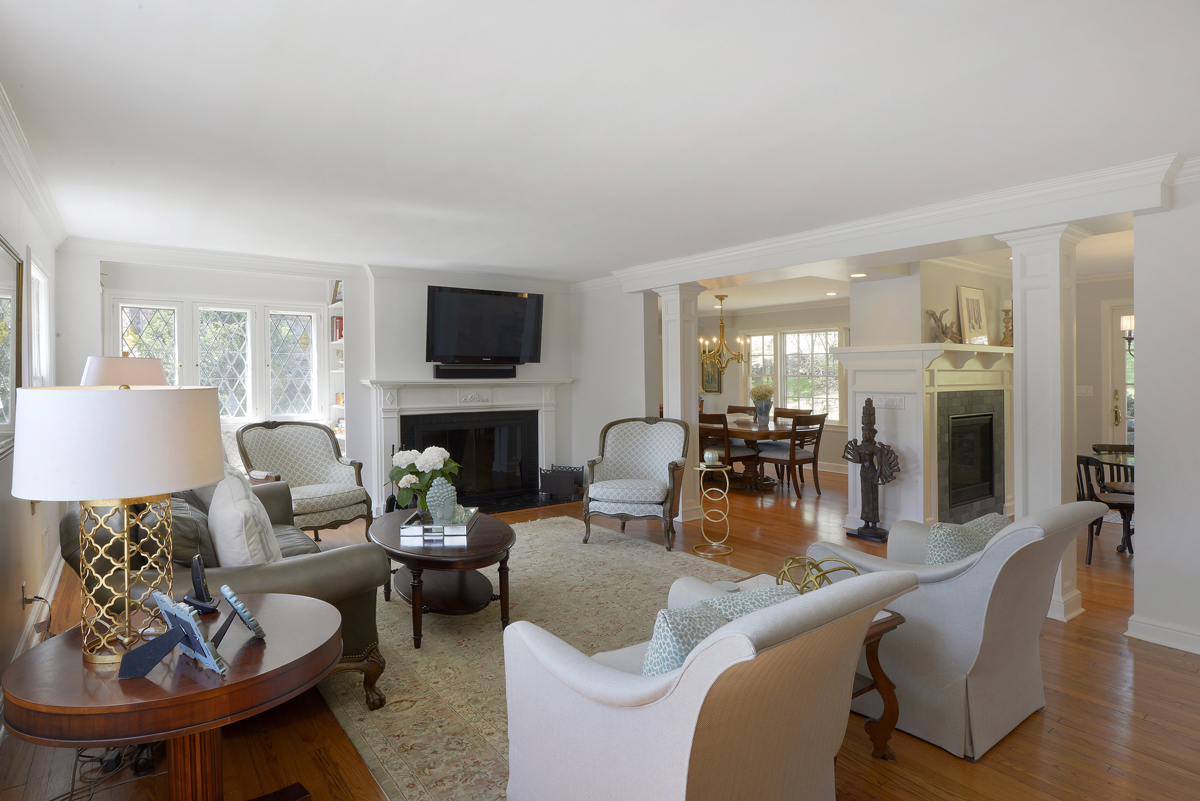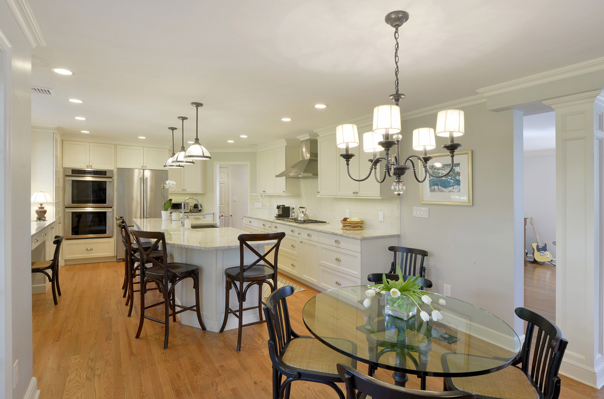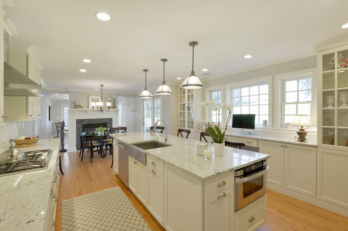 With the size of this project being significant, most of the first floor was re-configured down to the studs and opened up for better flow and sight lines between the kitchen, living room and dinning room. Solid hardwood oak flooring in a light stain was used through out the home to go along with new Andersen windows with SDL grilles.