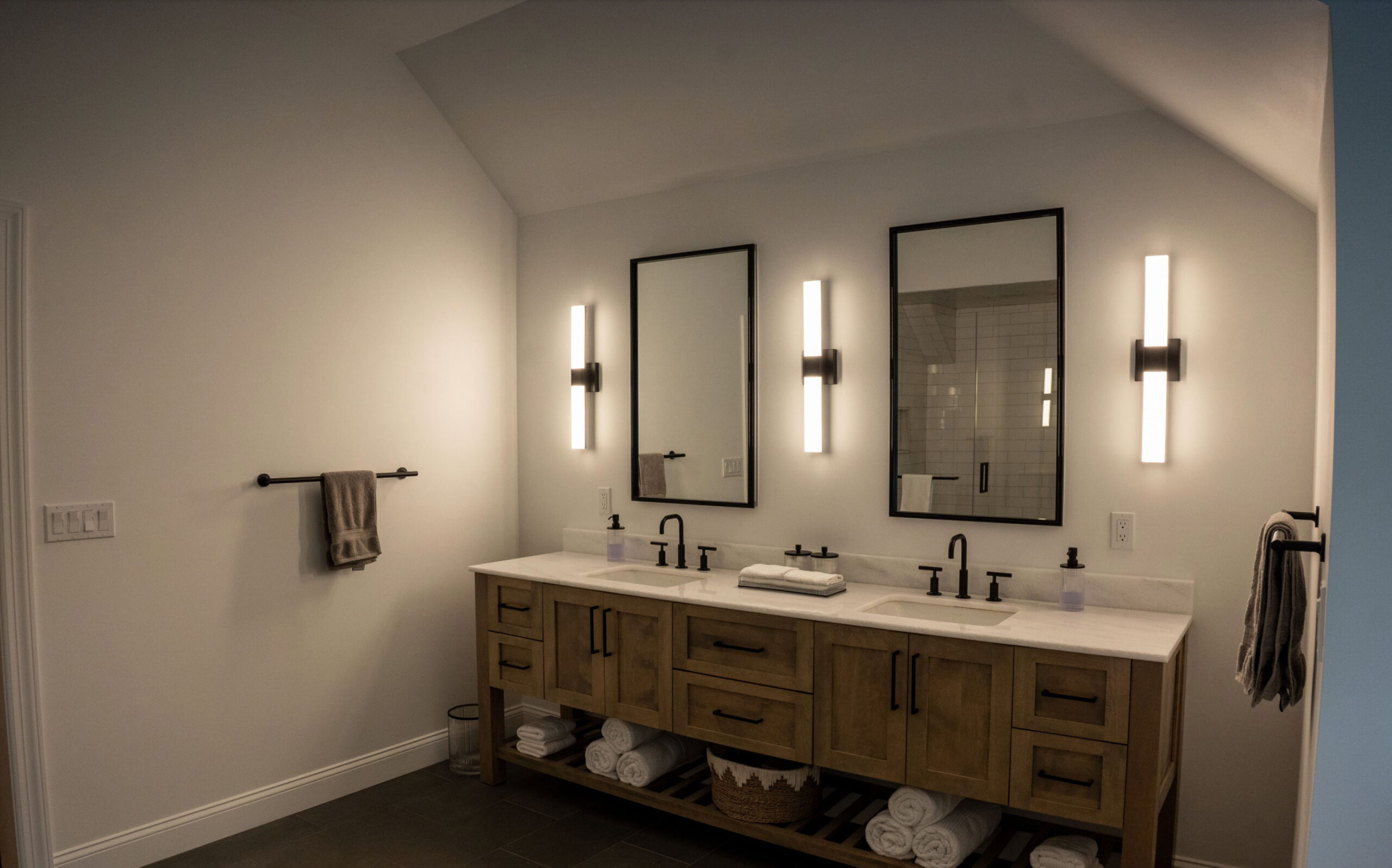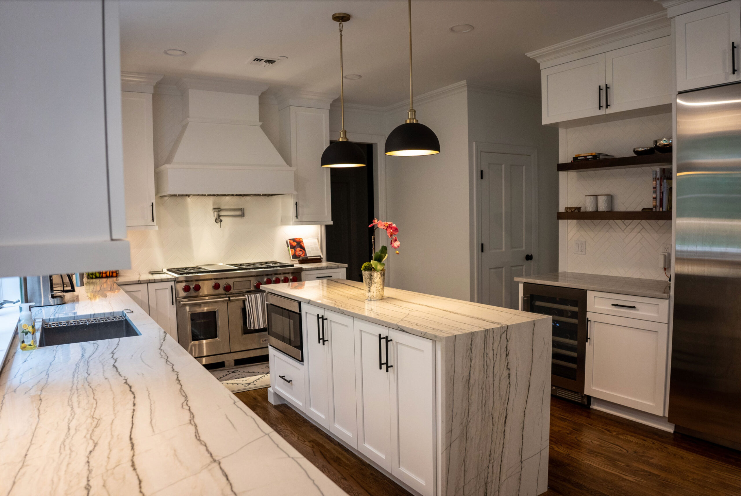 While it was not a complete home remodel, it did entail some of the most integral parts of the home. After gutting the kitchen we installed Adelphi Cabinets. Adelphi is one of the most reputable and quality forward companies in the United States. They were established in 1946 and are located in Pennsylvania. The produce cabinets the old fashioned way, one cabinet at a time. We chose a white maple cabinet set for them and covered the countertops in Quartzite. Quartzite countertops are produced using natural, porous stone that is cut to exact dimensions. Quartz countertops are engineered stone that is molded into custom shapes. Quality examples contain more than 90% loose quartz, with the remaining 7% being resins and other materials. The backsplash is done in a beautiful herringbone pattern white tile with some wood floating shelves to create a nice juxtaposition of contrasting materials. The flooring is oak plank to really give it a nice finish.
