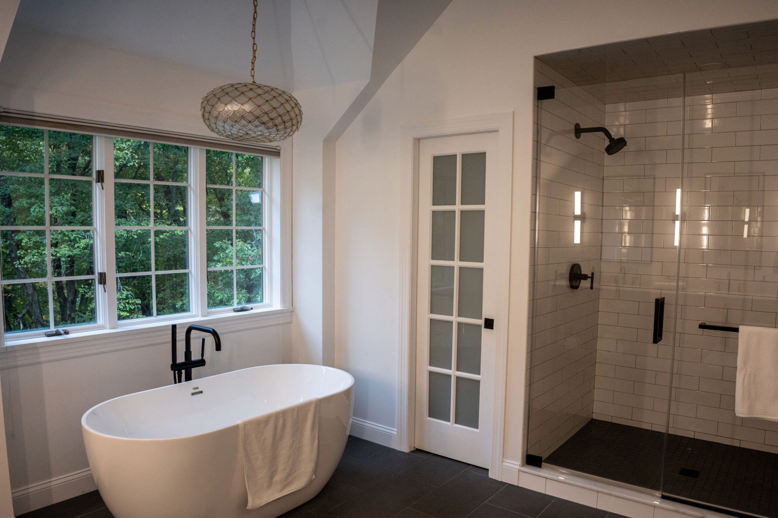 The updated master bathroom feature a freestanding tub, shower, separate water closet. Materials include Adelphi Vanity (stained) with marble counter top, black Kohler plumbing fixtures and a soaking tub. It really is a beautiful room.