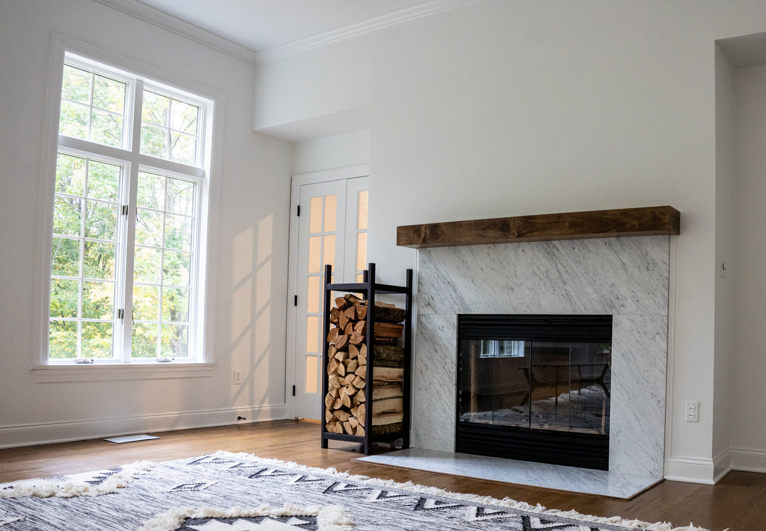 We updated their old fireplace with a contemporary marble finish and a wood candle to provide some contrast. The font doors were removed and we replaced them with a contemporary double doors.